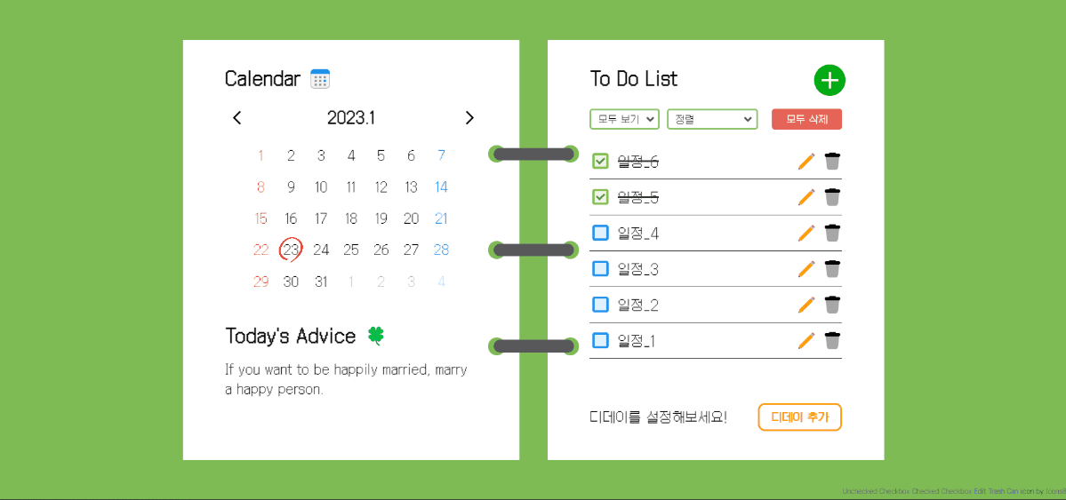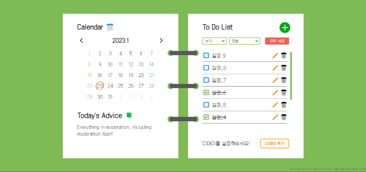 - 체크박스를 클릭하면 투두에 줄을 그으며 완료한 일로 넘어갑니다.