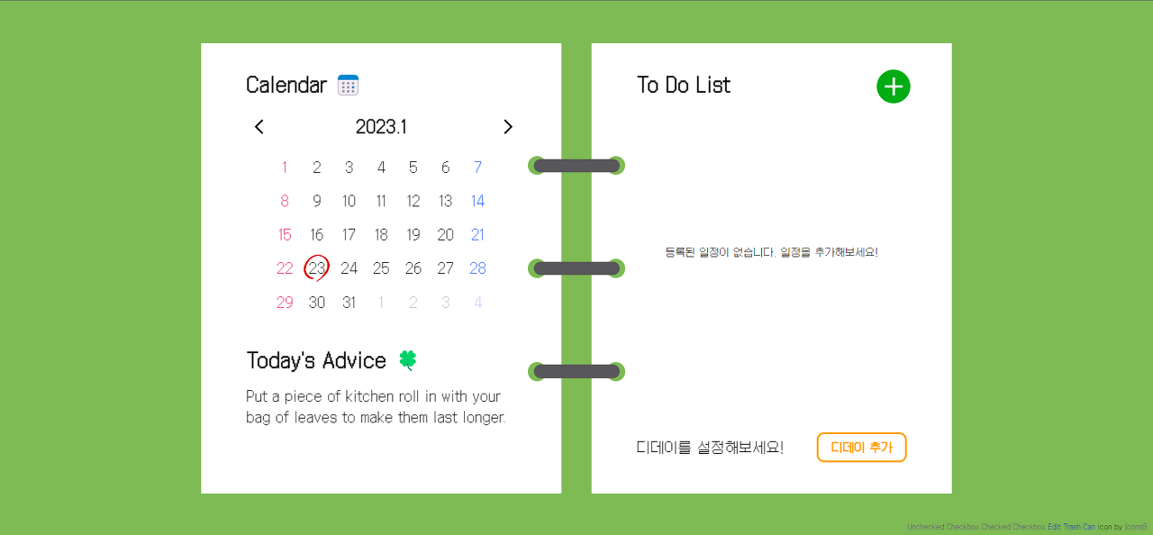 왼쪽 페이지에는 달력과 랜덤 명언이, 오른쪽 페이지에는 투두리스트와 디데이가 출력되도록 했다.