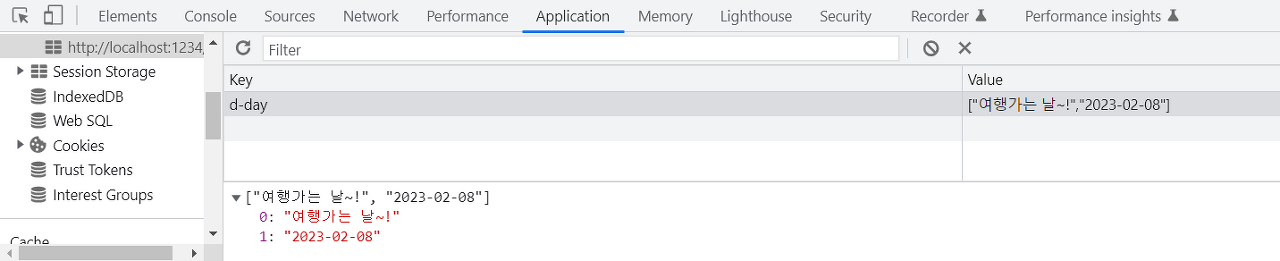- 완료 버튼 클릭 시 화면 구현 동시에 localStorage에 디데이 값이 저장됩니다.