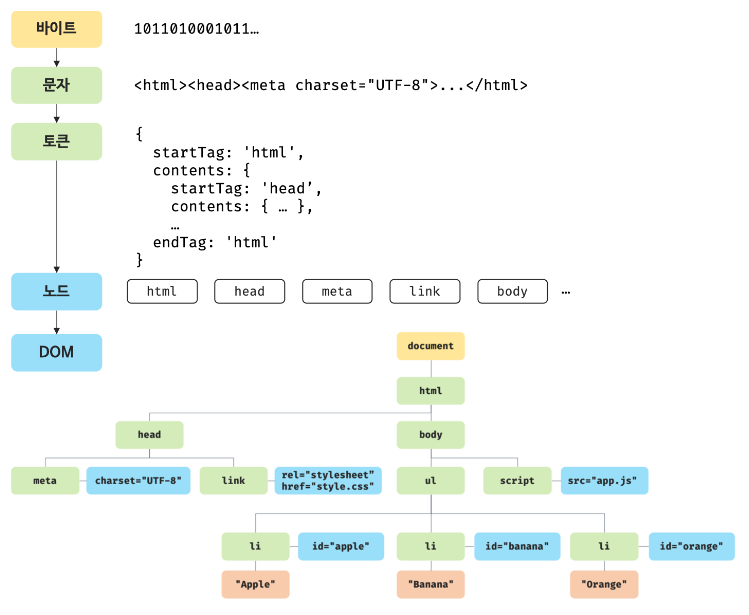 브라우저의 요청에 의해 서버가 응답한 HTML 문서는 문자열로 이루어진 순수한 텍스트다. 순수한 텍스트인 HTML 문서를 브라우저에 시각적인 픽셀로 렌더링하려면 HTML 문서를 브라우저가 이해할 수 있는 자료구조(객체)로 변환하여 메모리에 저장해야 한다.