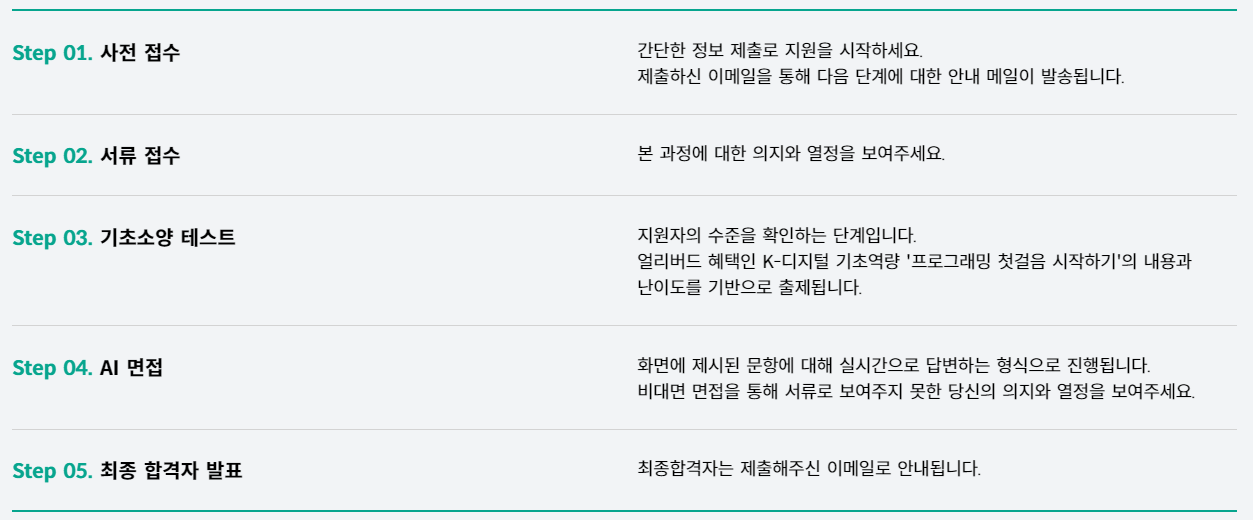 면접이라니... 그것도 AI 면접이라니!!! 면접볼 때마다 벌벌 떠는 나에게는 너무나 큰 산이였다. 게다가 메가바이트 스쿨 모집과정을 보게된 날이 마감일 하루 전날이였따...^.^... 그래서 허겁지겁 얼레벌레 벌벌 떨면서 지원을 어떻게 했는지도 기억이 안날 정도로 호닥닥 해버렸다. 물론 회사 면접이 아니라 학원 면접이지만 후리스 입고 머리 질끈 묶은 상태로 진행해벌임.. ^_^V 헤헤..