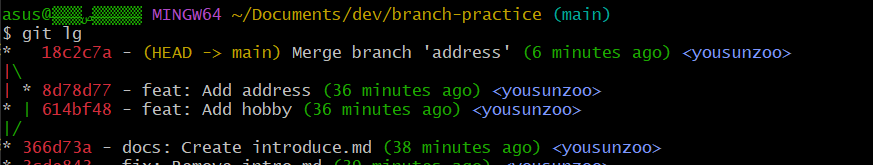 hobby, address에서의 커밋이 main으로 잘 병합된 것을 확인할 수 있다.