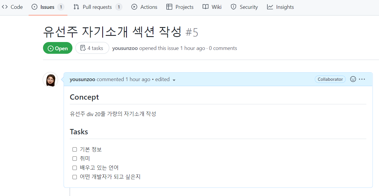 git flow feature를 통해서 작업 단위 별로 작업을 하고, 각 작업 단위가 끝나면 Team Repo에 올렸던 Issue의 Task에 하나씩 체크를 한다. 이것을 통해 다른 팀원들은 내 작업 진척도를 확인할 수 있다.