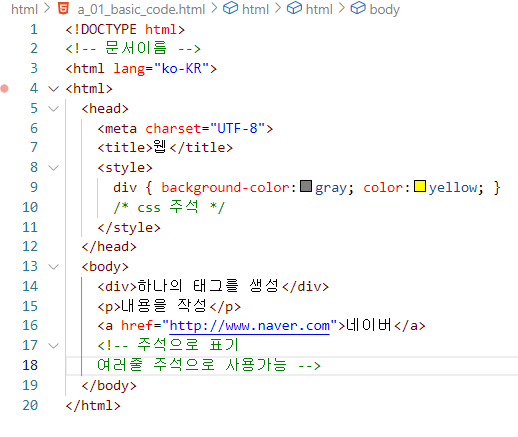 <!DOCTYPE html> → 웹 브라우저에게 html5 문서라는 것을 알리기 위함